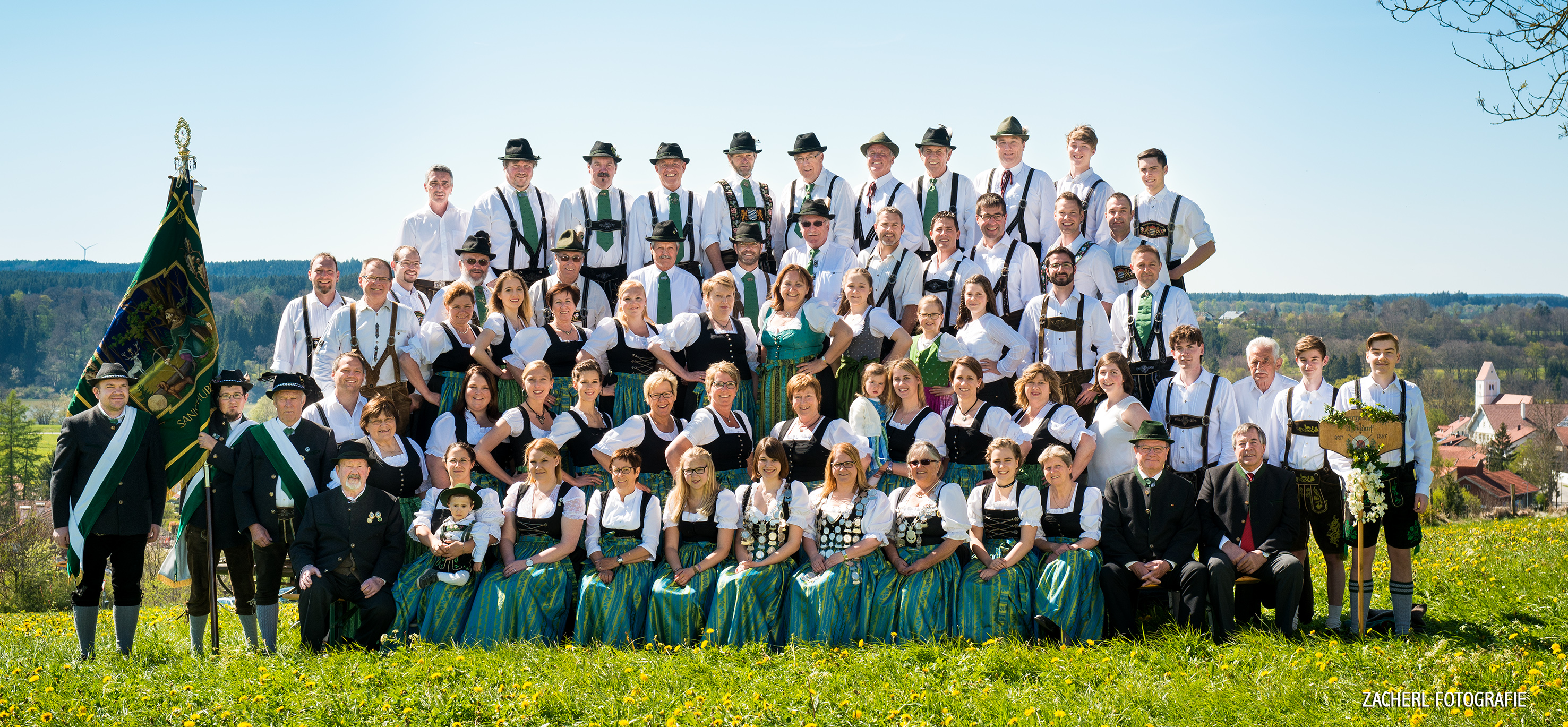Anlässlich unseres 150-jährigen Vereinsjubiläums haben wir wieder ein Vereinsfoto machen lassen. Bei strahlendem Sonnenschein (2 Tage vorher lag noch Schnee) haben sich viele Mitglieder dafür getroffen und die Damen konnten zum ersten Mal ihre neuen Schürzen präsentieren. |